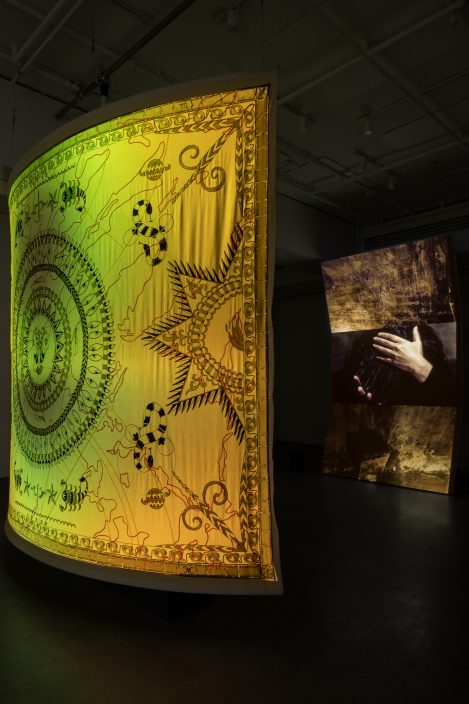 Aux images qu’elle conçoit et filme dans les sites et paysages splendides d’Asie centrale, Saodat Ismailova assortit des documents visuels et textuels ainsi que des extraits filmiques puisés dans les archives et le patrimoine cinématographique de son pays. « Les photographies, films et installations vidéographiques exposés à la Galerie de l’UQAM renferment plusieurs caractéristiques favorisant une expérience sensible des œuvres : le rythme souvent hypnotique des images, les éléments musicaux et sonores envoûtants, le scintillement des couleurs et des lumières, la matérialité sensuelle des broderies issues des traditions vernaculaires. À leur tour, les personnages et leurs murmures, la poésie éclairante des récits, la splendeur des paysages intemporels, l’évocation des eaux et des vents, et finalement la symbolique des cycles terrestres, lunaires et solaires nous laissent dans un état de suspension. Tout concourt à susciter des horizons réflexifs empreints de vertiges, de mystères, de révélations et de beauté. », explique la commissaire.